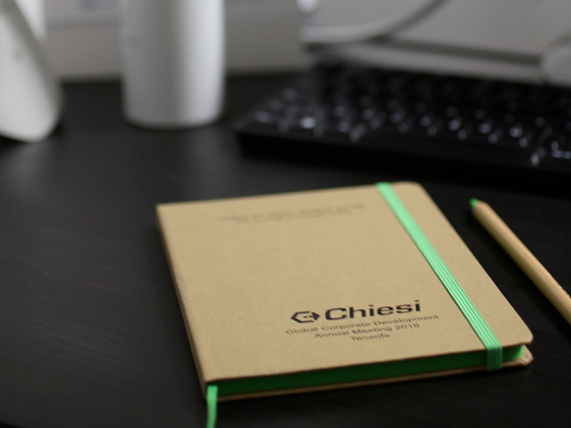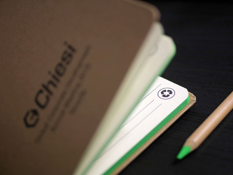 E’ stato realizzato un taccuino con copertina rigida in cartoncino avana e finiture in verde fluo. Elastico di chiusura e nastrino segnapagina. Pagine interne in carta 100% riciclata. Copertina personalizzata con logo e informazioni riguardanti l’evento.